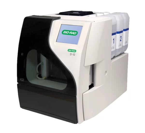 Analizador de Bio-Rad que realiza pruebas de hemoglobina de forma automatizada en un equipo compacto, utilizando la técnica de cromatografía líquida de alta resolución (HPLC) de intercambio iónico para medir diferentes tipos de hemoglobina, como la HbA1c (indicador de diabetes) y las hemoglobina fetales (HbF) y HbA2.